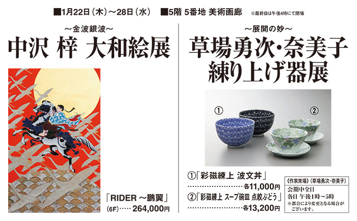 5階5番地 美術画廊からのお知らせ イベント一覧 Tweet 美術画廊 会期 2026年1月22日(木)~2月4日(水) フロアマップ ※万一、売切れの際はご容赦くださいませ。 ※諸般の都合により、営業時間・催事内容が変更となる場合がございます。