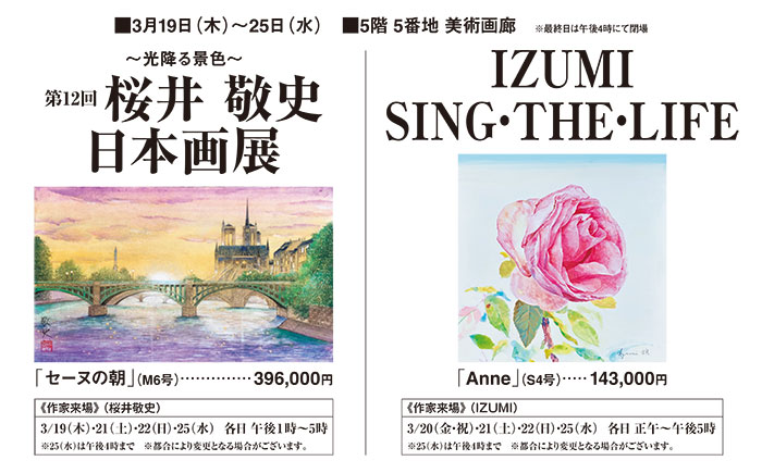 5階5番地 美術画廊からのお知らせ イベント一覧 Tweet 美術画廊 会期 2026年3月11日(水)~25日(水) フロアマップ ※万一、売切れの際はご容赦くださいませ。 ※諸般の都合により、営業時間・催事内容が変更となる場合がございます。
