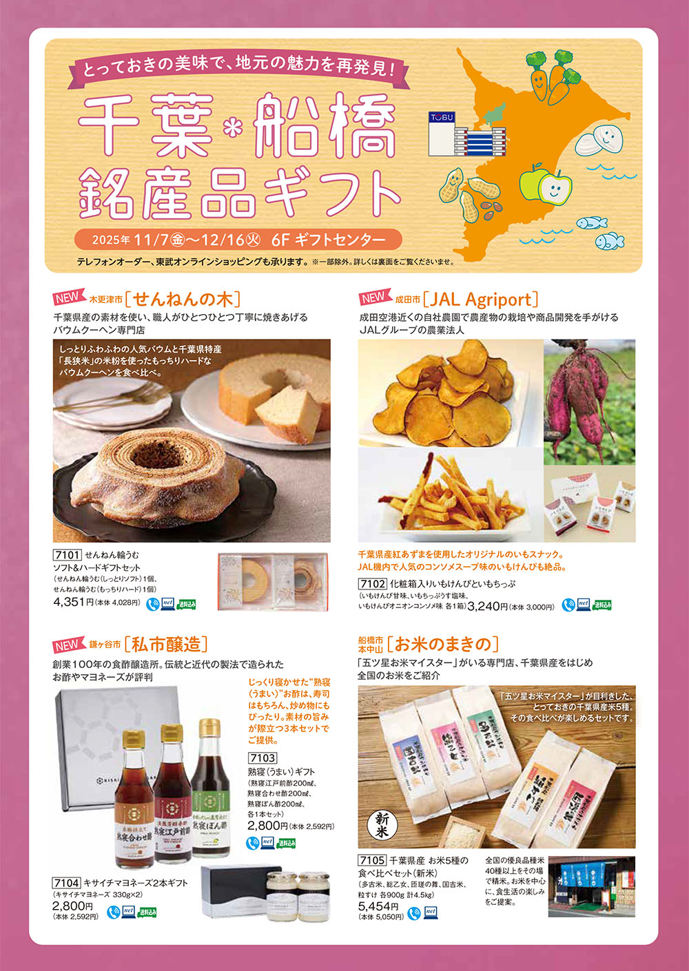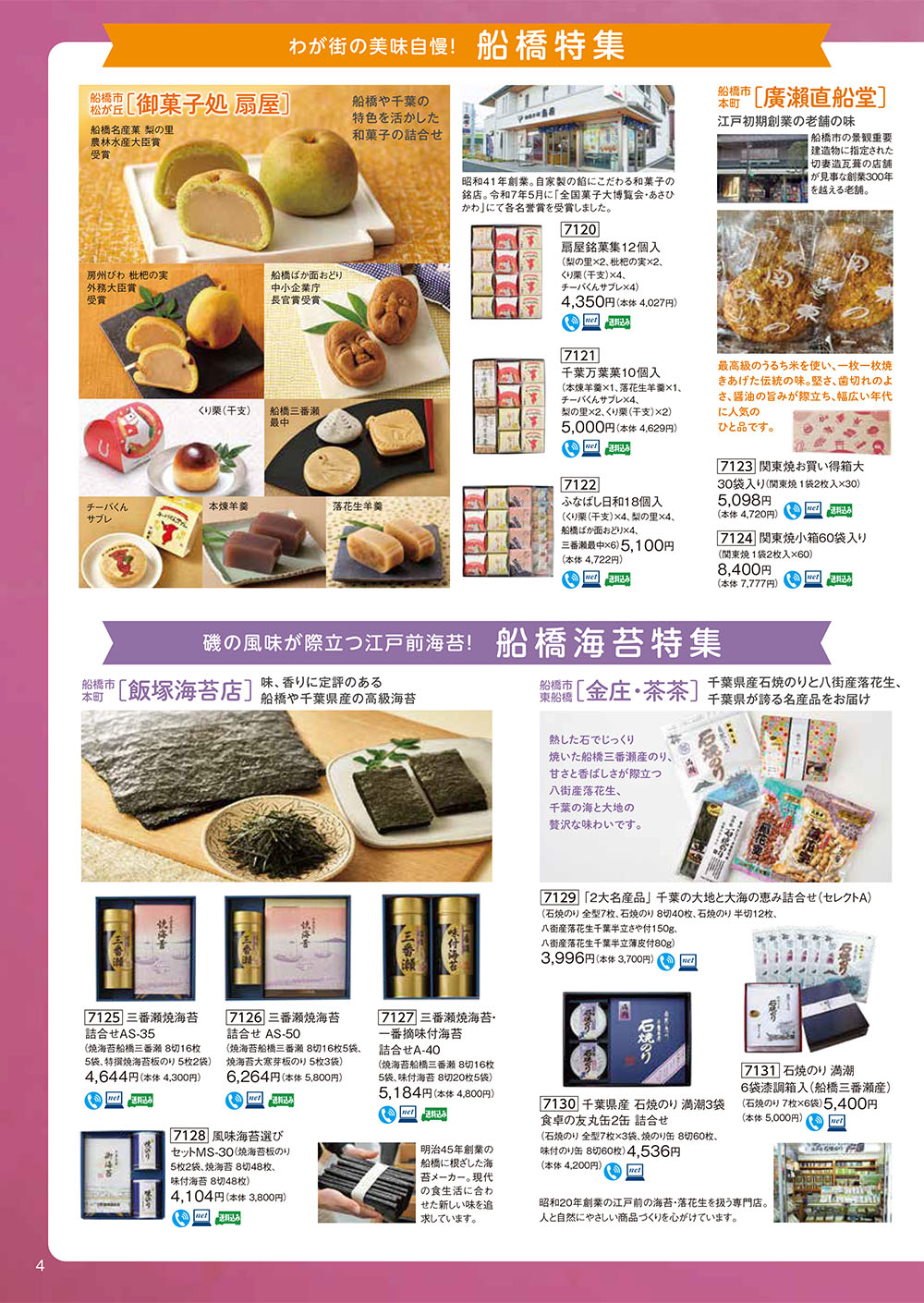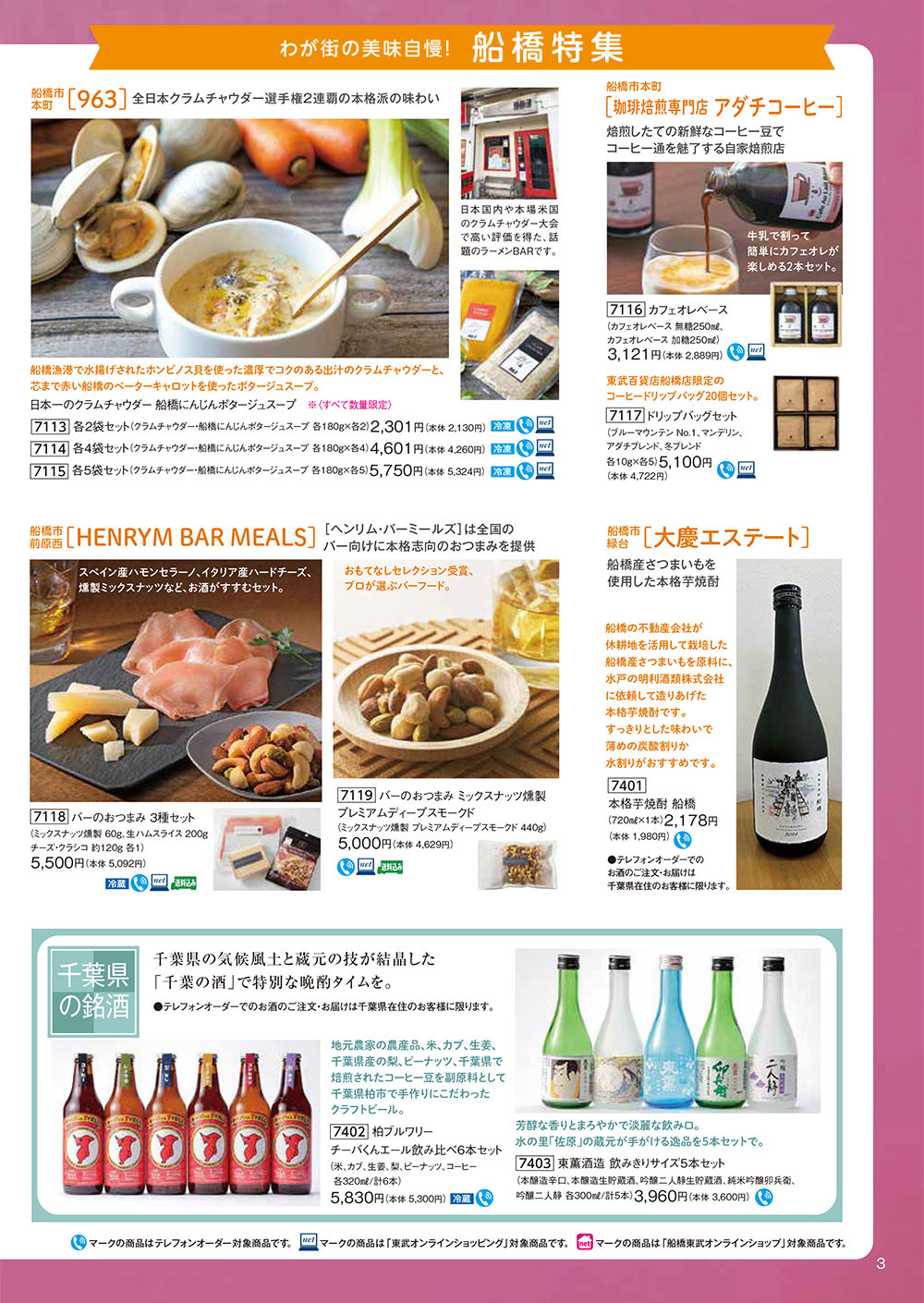 - ●テレフォンオーダーに限り代金引換手数料は無料、特別地区(千葉・東京・埼玉)への送料を一律880円、冷蔵・冷凍便は1,265円(一般便は30kgまで、冷蔵・冷凍便は15kgまで)といたします。
