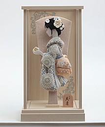 桜の花びらを拾い集める様子を羽子板で表現しています。アイボリーと水色の模様が合わさった爽やかなケースに、刺繍のレースが印象的なお飾りです。