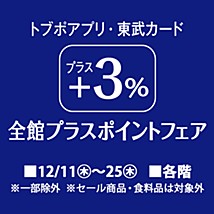 各階 トブポアプリ・東武カード +3% 全館プラスポイントフェア イベント一覧 Tweet トブポアプリ 東武カード プラスポイント 会期 2025年12月11日(木)~25日(木) 会期12/11(木)~25(木) 場所各階 ※一部除外 ※セール商品・食料品は対象外 ※ポイント付与は最大10%まで ※イベントの日時・内容等は予告なく変更になる場合がございます。 ※お車でのご来店は、道路の混雑が予想されます。電車・バスをご利用くださいませ。