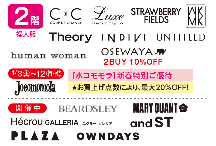 期間中、2~4階 婦人服・6階 紳士服売場にて、一会計10,000円(税込)以上お買上げの際に使用できる1,000円クーポンを合計250名様に、また5階 子供服売場にて、一会計5,000円(税込)以上お買上げの際に使用できる500円クーポンを50名様にそれぞれ配信!