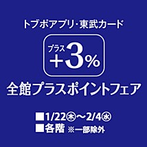 各階 トブポアプリ・東武カード +3%全館プラスポイントフェア イベント一覧 Tweet トブポアプリ 東武カード プラスポイント 会期 2026年1月22日(木)~2月4日(水) 会期1/22(木)~2/4(水) 場所各階 ※一部除外 ※セール商品・食料品は対象外 ※ポイント付与は最大10%まで ※イベントの日時・内容等は予告なく変更になる場合がございます。 ※お車でのご来店は、道路の混雑が予想されます。電車・バスをご利用くださいませ。