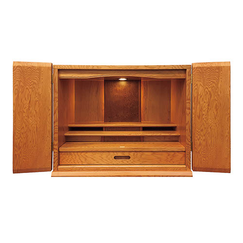 コンパクトでシンプルな家具調仏壇は、和室・洋室どちらにも合い、お手入れや移動も簡単。屋久杉の美しい杢目やぬくもりを感じる色合いが、お部屋に和みをもたらします。