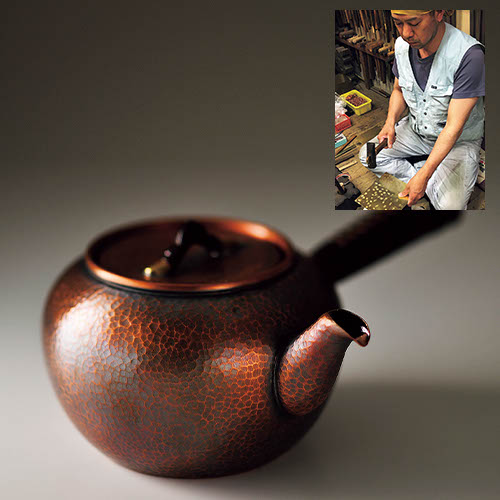 一枚の銅板から叩いて造る、丈夫で熱効率の良さを活かした急須です。あと漏れしないクチ切れの良さが自慢の逸品です。