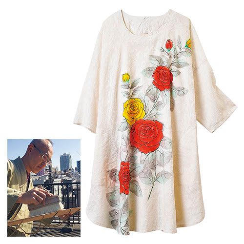“日常に和の趣”をテーマに、きものの伝統技術で染めあげた肌触りのよいチュニック。艶やかな色彩の薔薇の柄で華やぐ一枚。