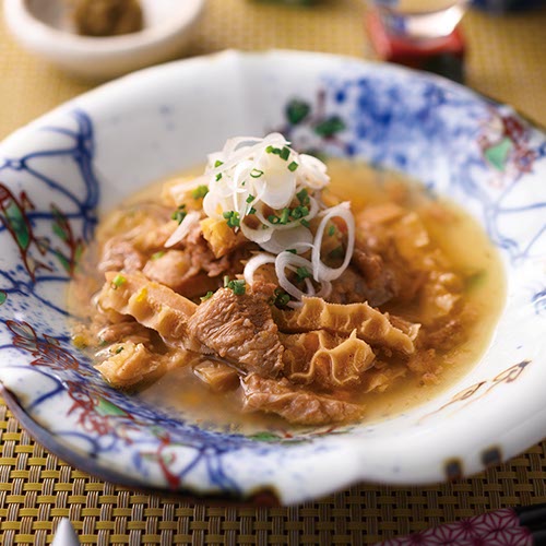 宮崎牛のスジ肉と牛胃ハチノスの塩柚子胡椒煮込み