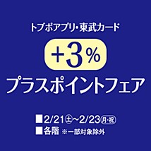 各階 トブポアプリ・東武カード +3%プラスポイントフェア イベント一覧 Tweet トブポアプリ 東武カード プラスポイント 会期 2026年2月21日(土)~23日(月) 会期2/21(土)~23(月・祝) 場所各階 ※一部対象除外 ※セール商品・食料品は対象外 ※ポイント付与は最大10%まで ※お車でのご来店は、道路の混雑が予想されます。電車・バスをご利用くださいませ。