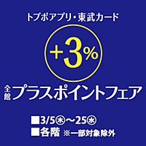 各階 トブポアプリ・東武カード 全館+3%プラスポイントフェア イベント一覧 Tweet トブポアプリ 東武カード プラスポイントフェア 会期 2026年3月5日(木)~25日(水) 会期3/5(木)~25(水) 場所各階 ※一部対象除外 ※セール商品・食料品は対象除外 ※ポイント付与は最大10%まで ※お車でのご来店は、道路の混雑が予想されます。電車・バスをご利用くださいませ。