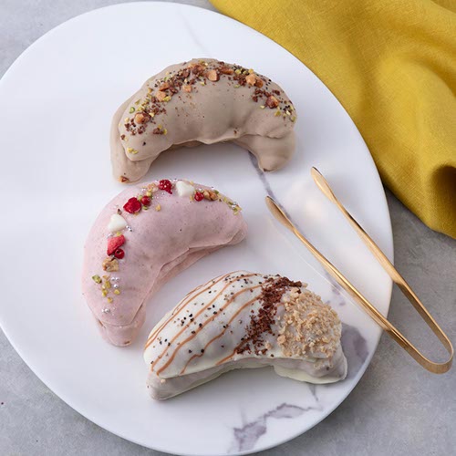 マカデミアナッツとカマンベールチーズを入れて、香ばしく焼き上げました。ココナッツ風味とジャンドゥーヤ風味の2種の味をお楽しみください。