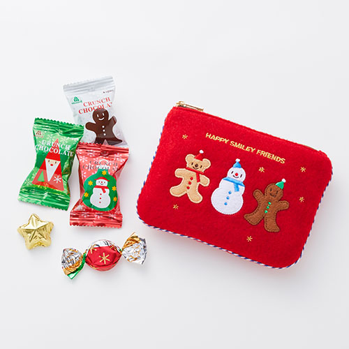 クリスマスベア、スノーマン、ジンジャーマンのかわいいアップリケをつけた刺繍入りポーチに、ミルクチョコレートとクランチチョコレートを詰合せました。