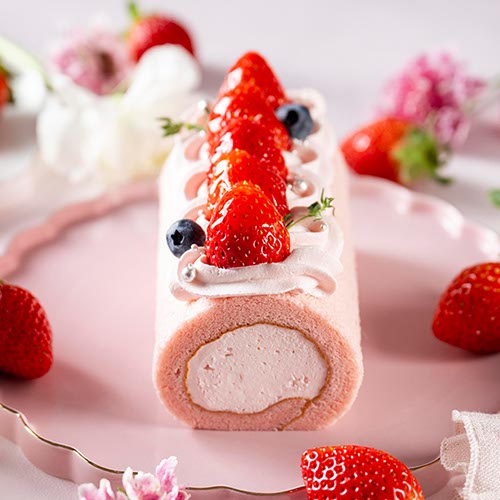 苺が香るピンク色の生地でピンク色のクリームを包み、キュートにデコレーションしたミニサイズのロールケーキ。