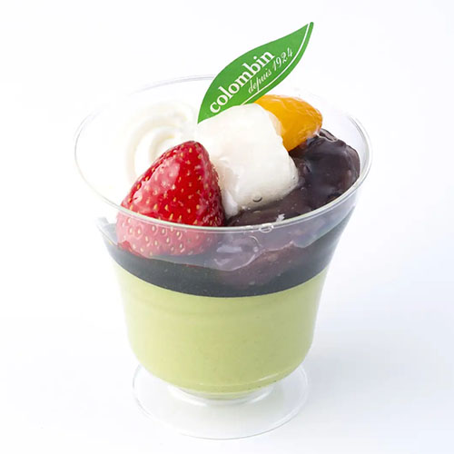 本格宇治抹茶のババロアを、あんみつ風にアレンジしました。北海道産小豆、苺、杏、求肥、バニラクリームを彩りよく飾りました。濃厚な抹茶ソースがアクセントの、最後まで飽きのこない和スイーツです。