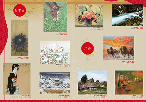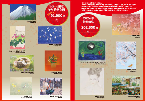 このたび美術画廊におきまして『新春 絵画ご奉仕会』を開催させていただきます。片岡球子・上村松園・東山魁夷・中島千波・ジャン=ピエールカシニョールなどの、国内外の巨匠作家から若手人気作家まで日本画や洋画、版画などの個性豊かな作品を一堂に取揃え、特別均一価格やご奉仕価格にてご紹介いたします。