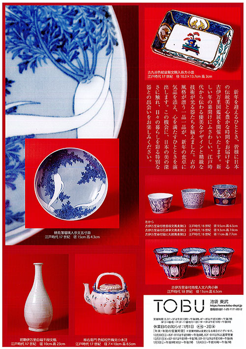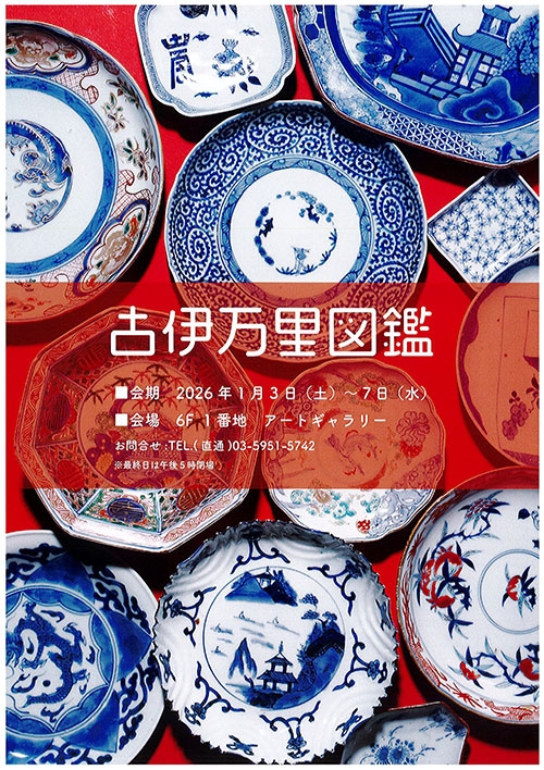 このたびアートギャラリーにおきまして『古伊万里図鑑』を開催させていただきます。江戸時代の生活の中で使われた猪口、皿、鉢など、現代の人々に「古伊万里」として愛用されつづけています。染付や色絵の器を中心に、身近で使える古き良き伊万里焼の器たちを紹介いたします。