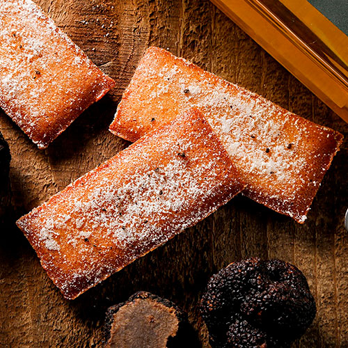ベースになるサブレ生地には国産バターとトリュフオイル、ブイヨンを加えてカリカリ食感に焼き上げ、最後に黒トリュフをブレンドしたオリジナルシーズニングパウダーで表面を仕上げました。口に入れた瞬間、濃厚で上品な黒トリュフの薫りとバターの風味。