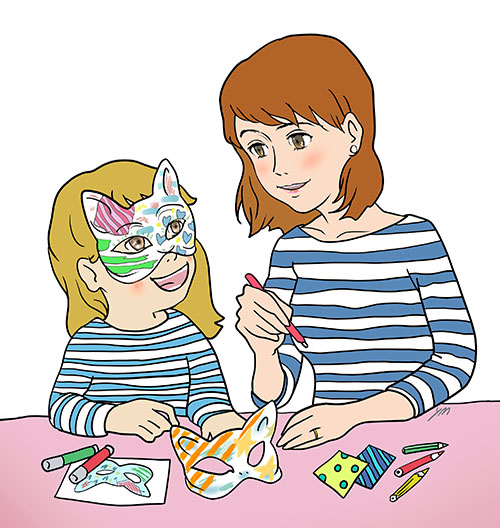 猫耳付きのアイマスクに[プチバトー]のハギレや色鉛筆・ペンでご自由に装飾し、オリジナルのハロウィンお面を作ります。