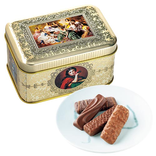 フランス国王ルイ・フィリップの宮殿画家フランツ・ヴィンターヘルターの絵画の缶に、4種のチョコレート菓子入り。