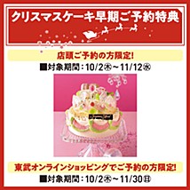 ■対象期間:10/2(木)~11/12(水)期間中、店頭にてクリスマスケーキをご予約いただいた先着1,000名様にB2F・B1F 食品フロアでお使いいただけるお買物券(500円分)をプレゼント。