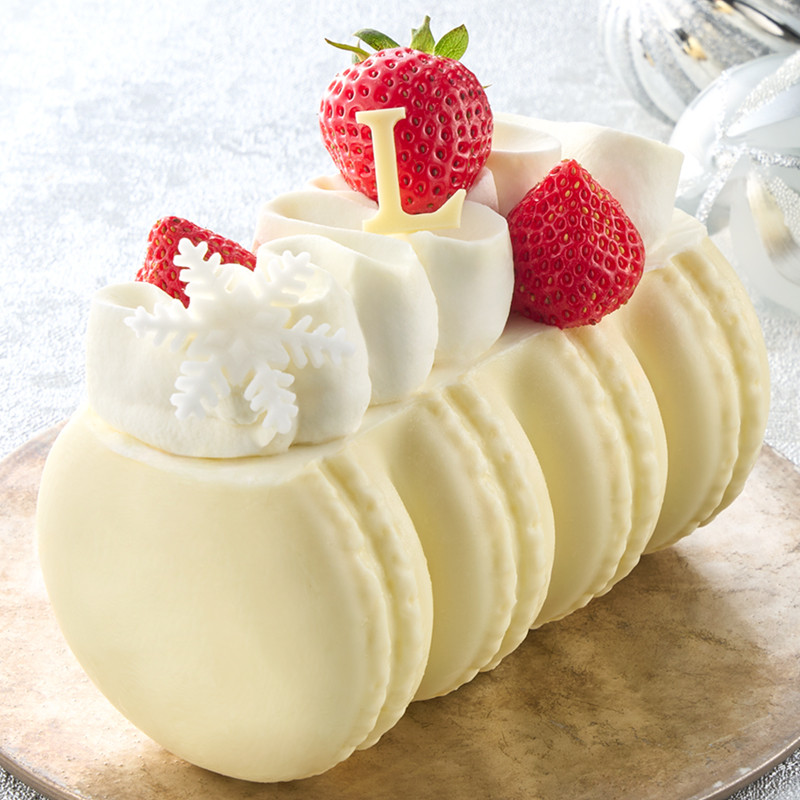 マカロンをイメージした愛らしいフォルム。たっぷりの生クリームと甘酸っぱいいちごのクーリが織りなす魅惑のマリアージュ。