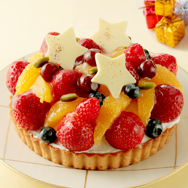 テーブルが華やぐフルーツタルト。甘さ控えめのシャンティクリームとたっぷりなコクのあるカスタードクリームが果物のおいしさを引き立てます。