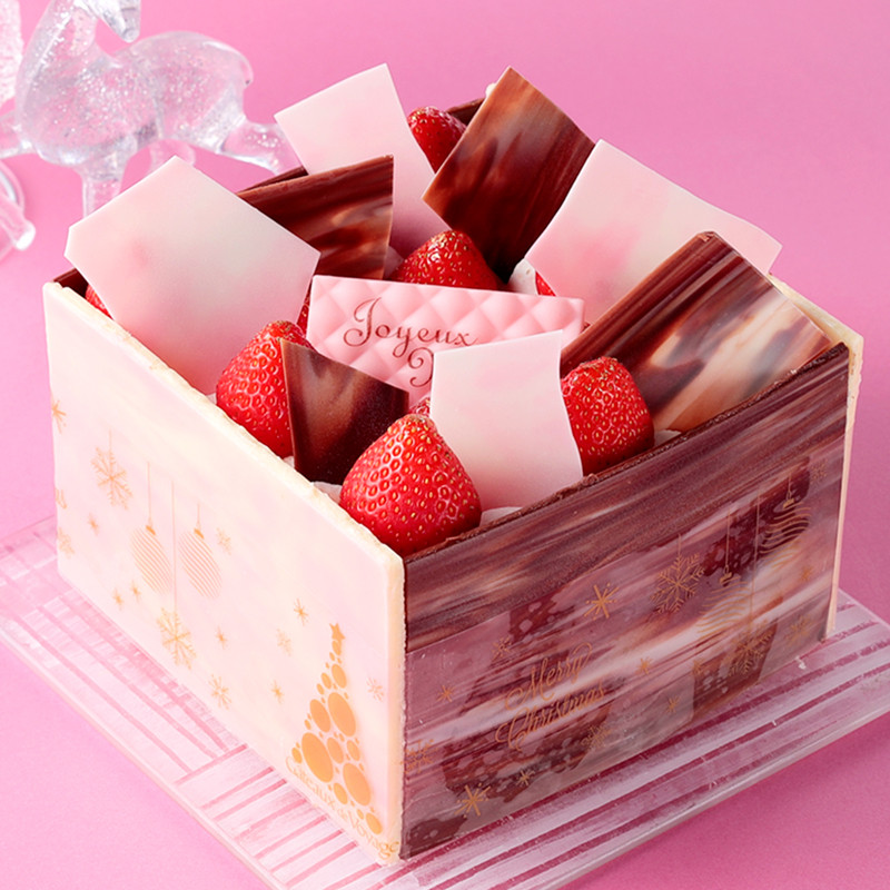胸が高鳴るダイナミックな色使い。宝石箱をイメージしたスクエア型の土台に、パリッとした薄いチョコレートや真っ赤ないちごをトッピング。