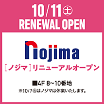 4F8~10番地 <予告>10/11(土)RENEWAL OPEN [ノジマ] イベント一覧 Tweet リニューアルオープン nojima ノジマ 家電 会期 2025年10月11日(土)~ フロアマップ 10/11(土) RENEWAL OPEN [ノジマ] リニューアルオープン ■4F 8~10番地 ※10/7(火)はノジマは休業いたします。 ※諸般の都合により、催事内容・出店店舗・イベント等が変更となる場合がございます。