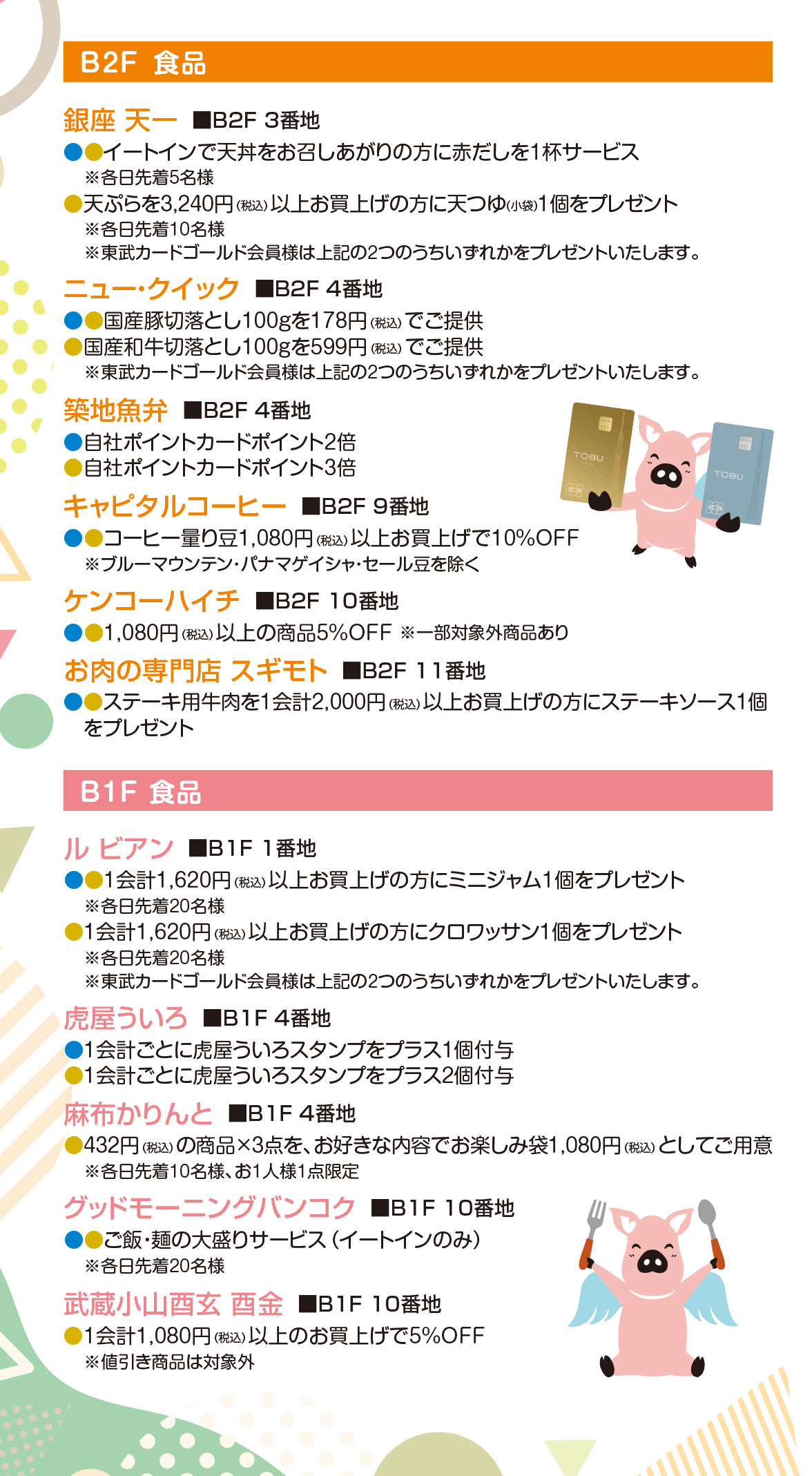 東武カードまたは、TOBU POINT アプリをご呈示またはお会計時にご利用いただくと、以下の特典やサービスをプレゼントいたします。