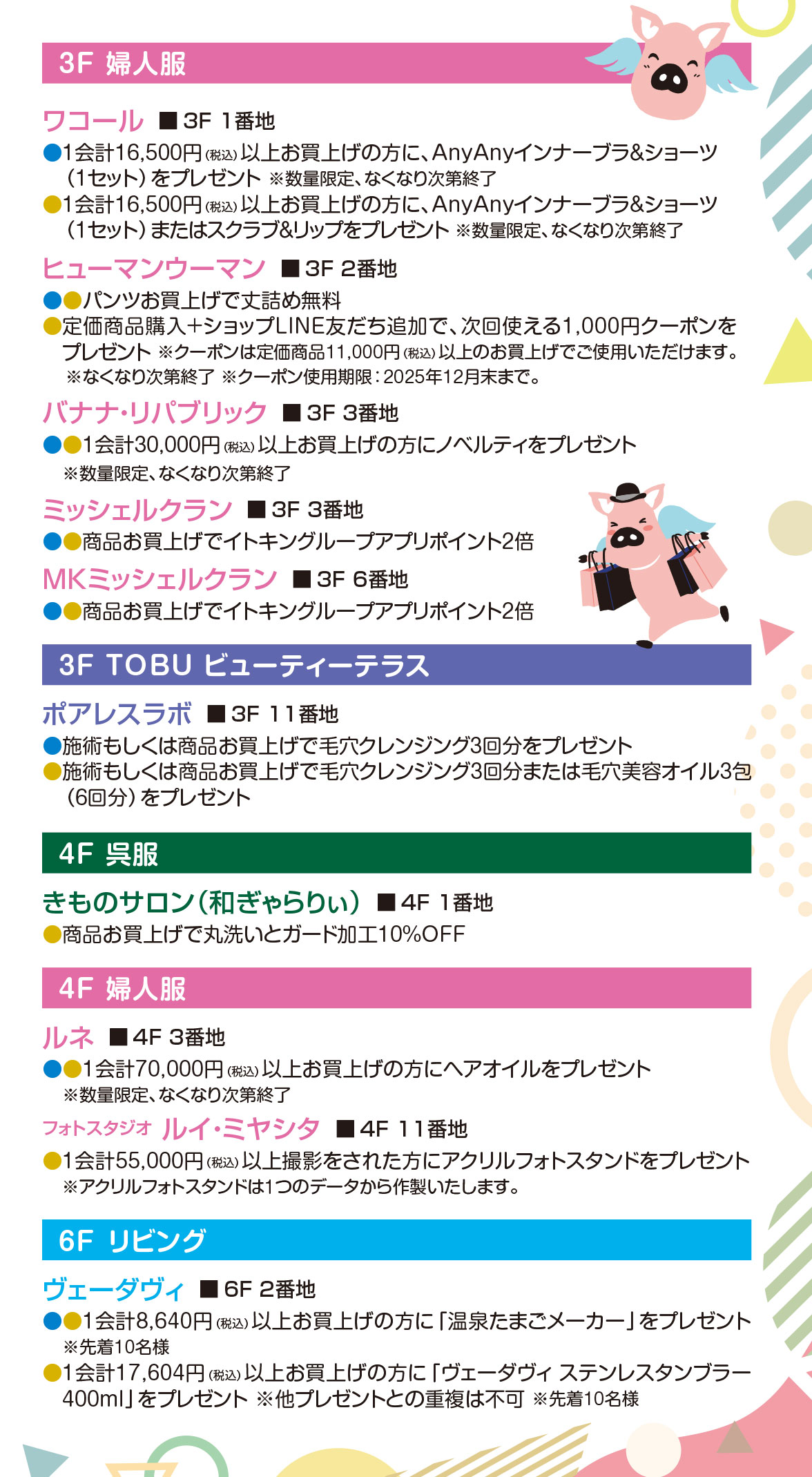 B2F~8F対象売場にて、新しい東武カード、従来の東武カード、TOBU POINT アプリのいずれかをご利用のうえ、1会計5,000円(税込)以上お買上げのレシートをご呈示いただくと、東武の商品券(最大10,000円分)などが当たる抽選会にご参加いただけます。