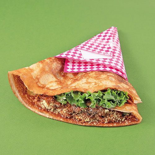 モッツァレラチーズとほろほろのプルドポークを包んだ、おかず系クレープ。