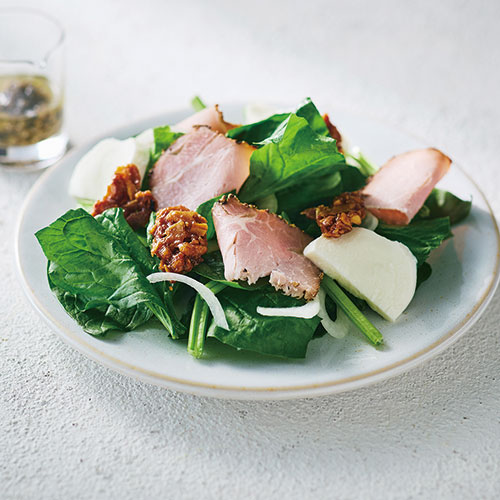 ほうれん草にモッツァレラチーズ、黒胡椒がきいたハム、キャラメルナッツを合せた食感も楽しめるサラダです。