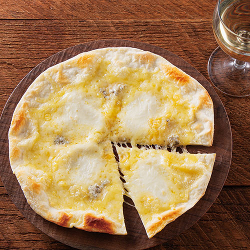 チーズ好きは歓喜!パリパリのクリスピー生地に、エダム、サムソー、モッツァレラ、ゴルゴンゾーラをトッピング。
