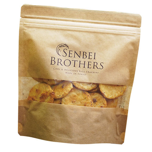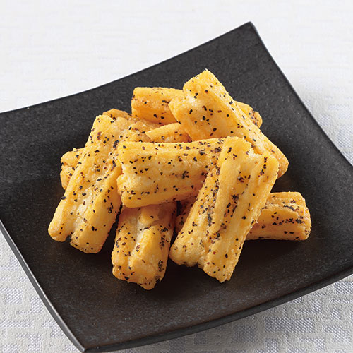 ピリッとした黒胡椒のスパイスと、濃口醤油の深いうま味があとを引く、パリッと食感の薄焼き煎餅です。