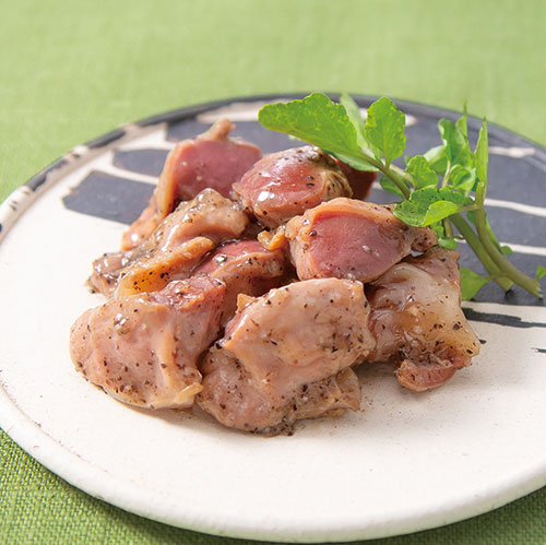 やわらかく茹でた砂肝に黒胡椒の辛みがきいたソースを絡めました。お酒のあてはもちろん、料理にも使えます。