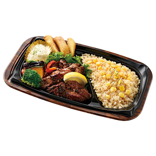 ごろっとしたペッパーポークに、コーン入りのガーリックライスが相性抜群。がっつり食べたい時におすすめ!