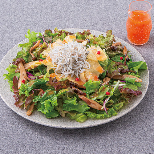 旬のしめじとしらすをのせ、ピンクペッパーを散らした秋のサラダ。チリトマトドレッシングで召しあがれ。