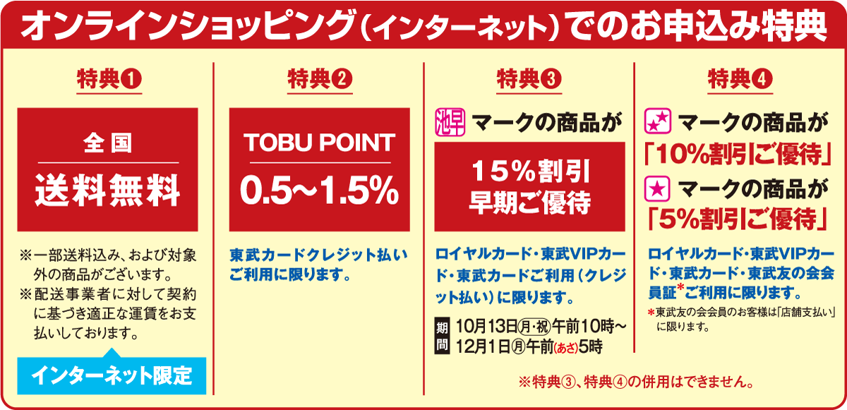※ご優待につきましては、ロイヤルカード、東武カードでのお支払い 早期ご優待会承り期間:10月13日(月・祝)午前10時~12月1日(月)午前(あさ)5時 (クレジットのみ)に限らせていただきます。
