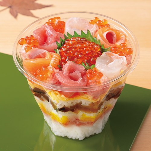 とろたくや椎茸の甘露煮を綺麗に重ね、まぐろ、サーモン、いくらを華やかに盛り付けました。