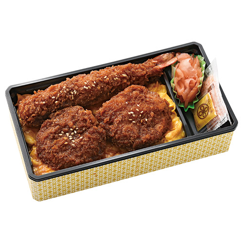 やわらかなヒレカツとプリプリのエビに、特製ソースを染み込ませ、ふわとろ卵の上にのせました。