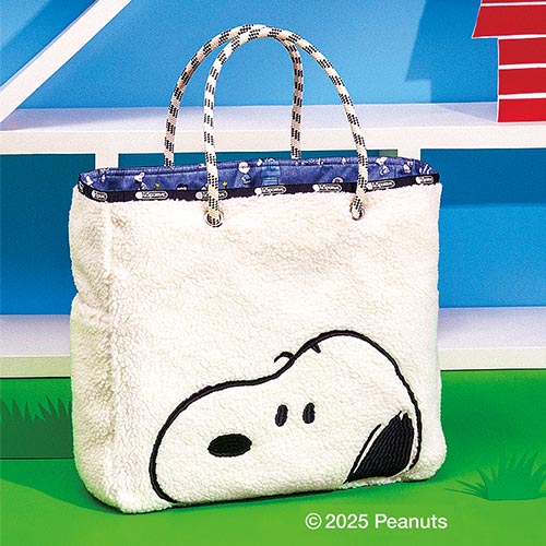 ボア素材にスヌーピーの顔がダイナミックに刺しゅうされたトートバッグ。裏面はデニム風の爽やかなデザイン。リバーシブルでお使いいただけます。