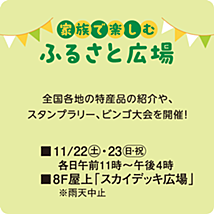 8F屋上「スカイデッキ広場」 家族で楽しむふるさと広場 イベント一覧 Tweet 特産品 イベント 会期 2025年11月22日(土)・23日(日) フロアマップ 会期11/22(土)・23(日・祝) 各日午前11時~午後4時 場所8F屋上「スカイデッキ広場」 ※雨天中止 全国各地の特産品の紹介や、 スタンプラリー、ビンゴ大会を開催! ※諸般の都合により、催事内容・出店店舗・イベント等が変更となる場合がございます。