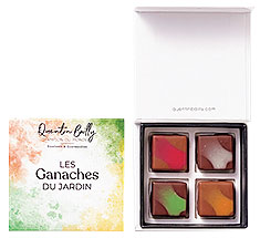 色鮮やかなラズベリー、洋梨、ミント、クレモンティーヌの、4種のガナッシュのアソート。
