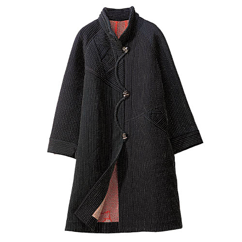 表地は黒絹、裏地に華やかな絞りを合わせ、モダンなパッチワークを施した刺子コート。