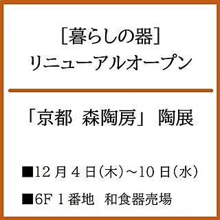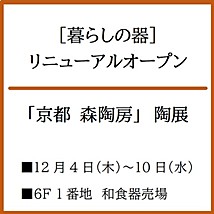 6F 1番地食器 食器売場 リニューアルオープン 京都 森陶房 陶展 イベント一覧 Tweet 食器 リニューアルオープン 京都 森陶房 陶展 会期 2025年12月4日(木)~10日(水) フロアマップ [暮らしの器]リニューアルオープン 季節に合わせた、暮らしを彩る様々な器たち。 より見やすく、温かみのある売場へとリニューアルオープン。 「京都 森陶房」 陶展 繊細な筆づかいが織りなす美しさ、ひと筆ひと筆丹念に絵付けされた染付の器をご紹介いたします。 ぜひご高覧ください。