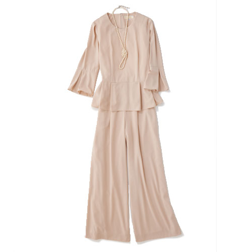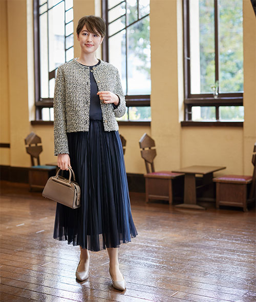 上品な正統派スタイルを柔らかな色合いでまとめたアンサンブル。