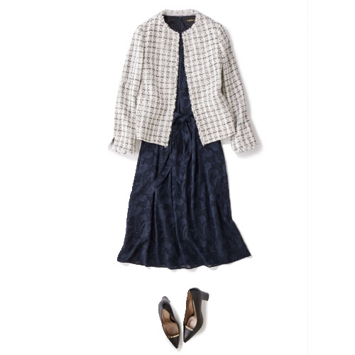 ツイードジャケットにふんわりスカートで、正統派エレガンス。それぞれ単品でも活躍!
