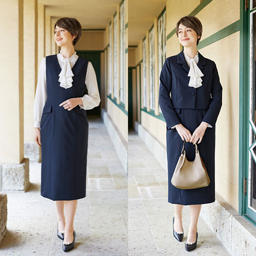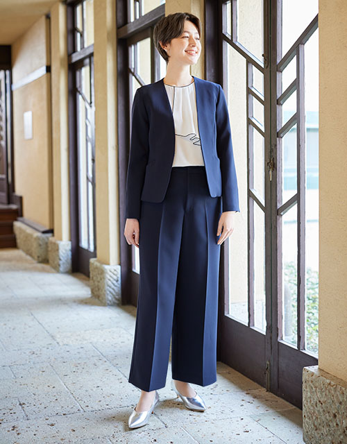シンプルなスーツでも、中のブラウスを替えればバリエーションが広がります。