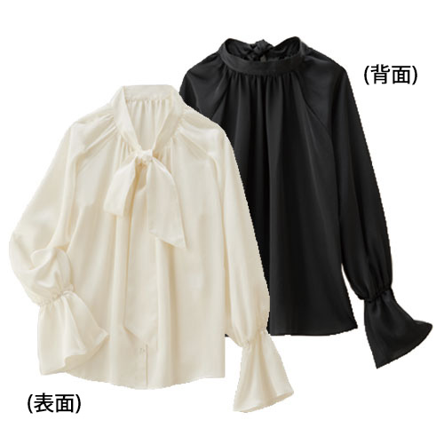 ボウタイを結んでフェミニンに、背面を前に着ればクラシカルなハイネックに。サテン素材とふんわりベルスリーブが麗しい2WAYブラウス。