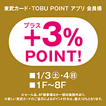 1F~8F 東武カード・TOBU POINT アプリ 会員様限定+3%POINT! イベント一覧 Tweet 東武カード TOBU POINT アプリ プラスポイント 会期 2026年1月3日(土)・4日(日) 会期1/3(土)・4(日) 場所1F~8F ※セール品、8F催事場ほか一部対象除外あり。 ※新しい東武カードのご呈示によるポイント付与は、 最大10%となります。 ※諸般の都合により、催事内容・出店店舗・イベント等が変更となる場合がございます。