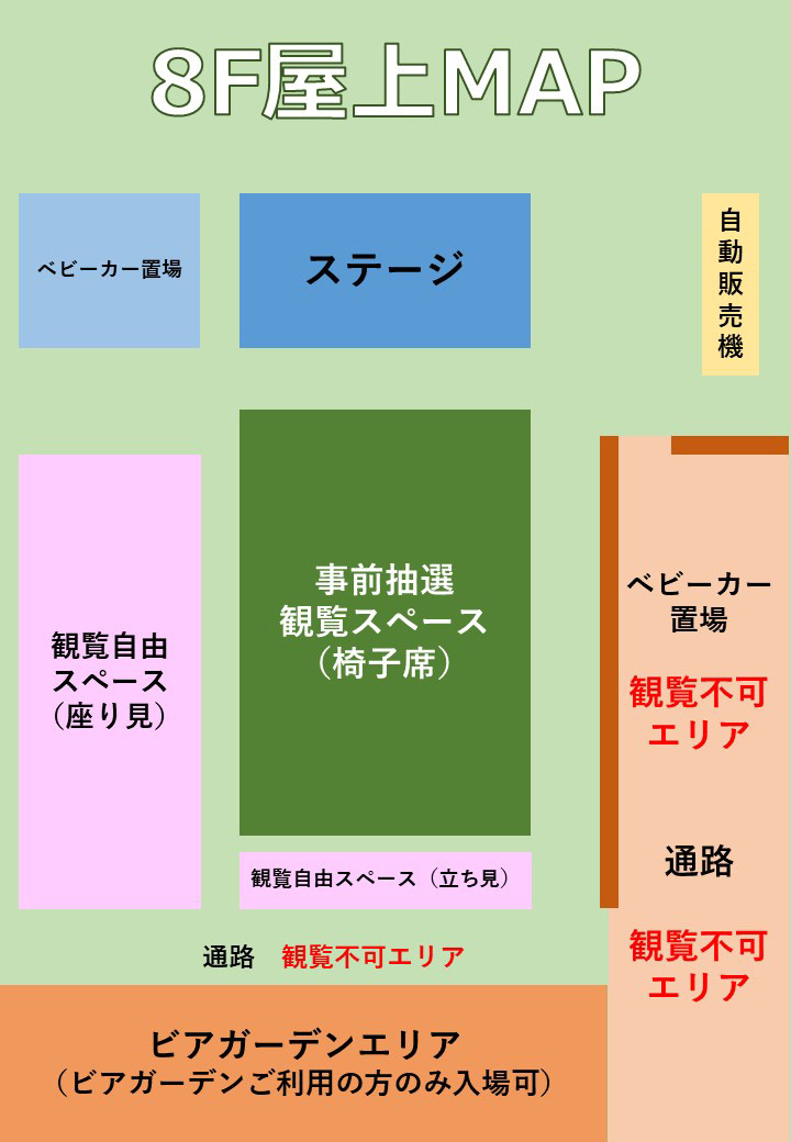 ※人数目安を超えるお客様のご来店があった際は、開場前・イベント開始前等に関わらず観覧スペースまたは屋上への入場を制限させていただく場合がございます。あらかじめご了承ください。